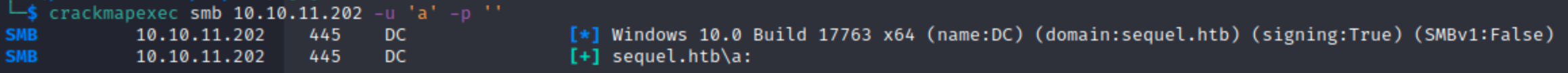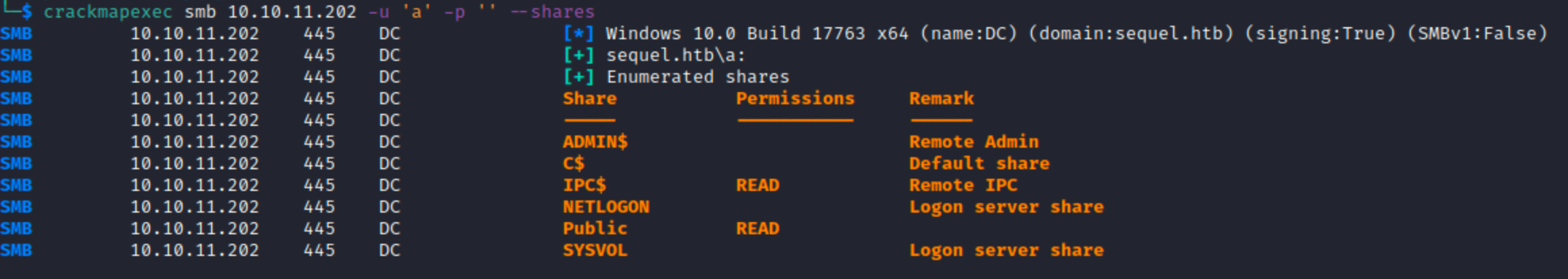 PORT STATE SERVICE VERSION53/tcp open domain Simple DNS Plus88/tcp open kerberos-sec Microsoft Windows Kerberos (server time: 2023-04-01 06:24:35Z)135/tcp open msrpc Microsoft Windows RPC139/tcp open netbios-ssn Microsoft Windows netbios-ssn389/tcp open ldap Microsoft Windows Active Directory LDAP (Domain: sequel.htb0., Site: Default-First-Site-Name)| ssl-cert: Subject: commonName=dc.sequel.htb| Subject Alternative Name: othername:<unsupported>, DNS:dc.sequel.htb| Not valid before: 2022-11-18T21:20:35|_Not valid after: 2023-11-18T21:20:35|_ssl-date: 2023-04-01T06:25:58+00:00; +8h00m01s from scanner time.445/tcp open microsoft-ds?464/tcp open kpasswd5?593/tcp open ncacn_http Microsoft Windows RPC over HTTP 1.0636/tcp open ssl/ldap Microsoft Windows Active Directory LDAP (Domain: sequel.htb0., Site: Default-First-Site-Name)|_ssl-date: 2023-04-01T06:25:57+00:00; +8h00m00s from scanner time.| ssl-cert: Subject: commonName=dc.sequel.htb| Subject Alternative Name: othername:<unsupported>, DNS:dc.sequel.htb| Not valid before: 2022-11-18T21:20:35|_Not valid after: 2023-11-18T21:20:351433/tcp open ms-sql-s Microsoft SQL Server 2019 15.00.2000.00; RTM|_ssl-date: 2023-04-01T06:25:58+00:00; +8h00m01s from scanner time.| ssl-cert: Subject: commonName=SSL_Self_Signed_Fallback| Not valid before: 2023-03-31T16:55:58|_Not valid after: 2053-03-31T16:55:58| ms-sql-ntlm-info:| Target_Name: sequel| NetBIOS_Domain_Name: sequel| NetBIOS_Computer_Name: DC| DNS_Domain_Name: sequel.htb| DNS_Computer_Name: dc.sequel.htb| DNS_Tree_Name: sequel.htb|_ Product_Version: 10.0.177633268/tcp open ldap Microsoft Windows Active Directory LDAP (Domain: sequel.htb0., Site: Default-First-Site-Name)|_ssl-date: 2023-04-01T06:25:58+00:00; +8h00m01s from scanner time.| ssl-cert: Subject: commonName=dc.sequel.htb| Subject Alternative Name: othername:<unsupported>, DNS:dc.sequel.htb| Not valid before: 2022-11-18T21:20:35|_Not valid after: 2023-11-18T21:20:353269/tcp open ssl/ldap Microsoft Windows Active Directory LDAP (Domain: sequel.htb0., Site: Default-First-Site-Name)|_ssl-date: 2023-04-01T06:25:57+00:00; +8h00m00s from scanner time.| ssl-cert: Subject: commonName=dc.sequel.htb| Subject Alternative Name: othername:<unsupported>, DNS:dc.sequel.htb| Not valid before: 2022-11-18T21:20:35|_Not valid after: 2023-11-18T21:20:35Service Info: Host: DC; OS: Windows; CPE: cpe:/o:microsoft:windows