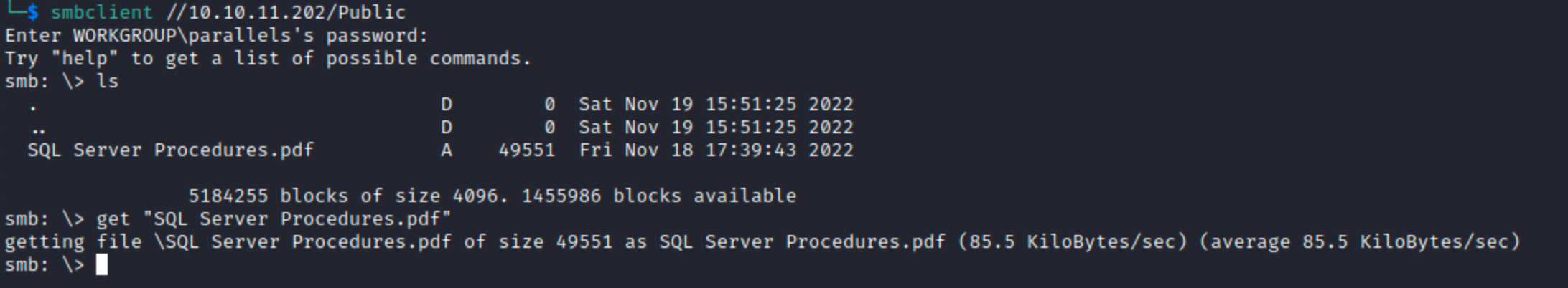 Host script results:| smb2-security-mode:| 3.1.1:|_ Message signing enabled and required| smb2-time:| date: 2023-04-01T07:20:36|_ start_date: N/A|_clock-skew: mean: 7h59m58s, deviation: 1s, median: 7h59m58s| ms-sql-info:| 10.10.11.202:1433:| Version:| name: Microsoft SQL Server 2019 RTM| number: 15.00.2000.00| Product: Microsoft SQL Server 2019| Service pack level: RTM| Post-SP patches applied: false|_ TCP port: 1433We can see that some ports are open. I started exploiting SMB using crackmapexec. I tried logging in with null sessions but it didn’t work but it turned out that anonymous login in turned on. Then I enumerated shares and connected to the service using smbclient and found interesting pdf file on Public share with mssql username and password.