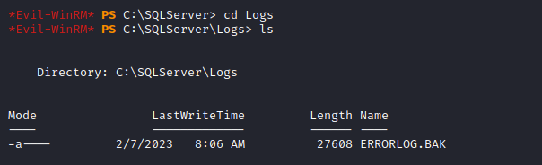 I digged into sql_svc user folders (Documents,Desktop and etc..), nothing interesting there but I found SQLServer/Logs folder inside C drive with ERRORLOG.BAK file inside.