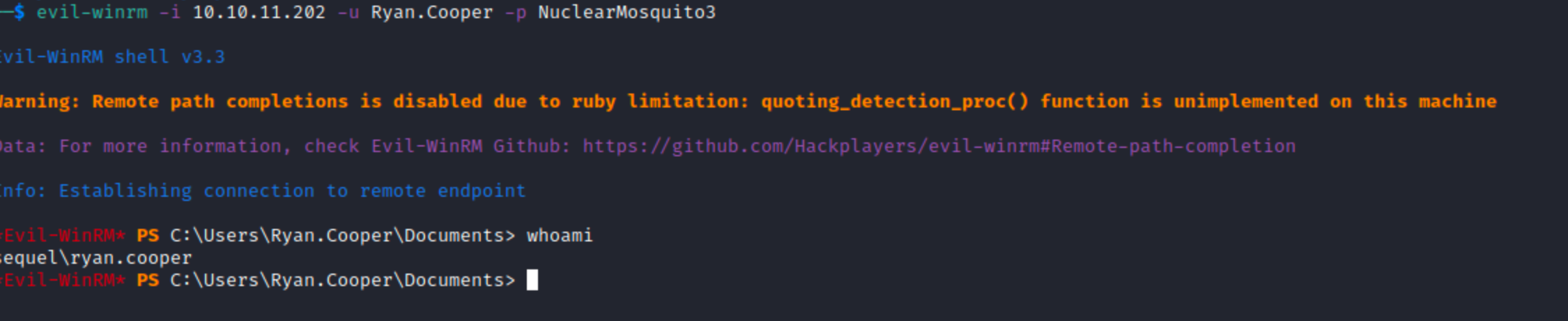 I bruteforced passwords for this usernames but all of them was unusuccessful. NuclearMosquito3 looked like a password and tried to use it with Ryan.Cooper username and I got the user flag