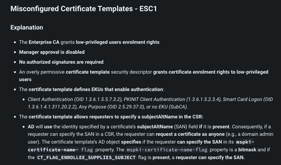 "Certificate Templates": { "0": { "Template Name": "UserAuthentication", "Display Name": "UserAuthentication", "Certificate Authorities": [ "sequel-DC-CA" ], "Enabled": true, "Client Authentication": true, "Enrollment Agent": false, "Any Purpose": false, "Enrollee Supplies Subject": true, "Certificate Name Flag": [ "EnrolleeSuppliesSubject" ], "Enrollment Flag": [ "IncludeSymmetricAlgorithms", "PublishToDs" ], "Private Key Flag": [ "ExportableKey" ], "Extended Key Usage": [ "Client Authentication", "Secure Email", "Encrypting File System" ], "Requires Manager Approval": false, "Requires Key Archival": false, "Authorized Signatures Required": 0, "Validity Period": "10 years", "Renewal Period": "6 weeks", "Minimum RSA Key Length": 2048, "Permissions": { "Enrollment Permissions": { "Enrollment Rights": [ "SEQUEL.HTB\\Domain Admins", "SEQUEL.HTB\\Domain Users", "SEQUEL.HTB\\Enterprise Admins" ] }, "Object Control Permissions": { "Owner": "SEQUEL.HTB\\Administrator", "Write Owner Principals": [ "SEQUEL.HTB\\Domain Admins", "SEQUEL.HTB\\Enterprise Admins", "SEQUEL.HTB\\Administrator" ], "Write Dacl Principals": [ "SEQUEL.HTB\\Domain Admins", "SEQUEL.HTB\\Enterprise Admins", "SEQUEL.HTB\\Administrator" ], "Write Property Principals": [ "SEQUEL.HTB\\Domain Admins", "SEQUEL.HTB\\Enterprise Admins", "SEQUEL.HTB\\Administrator" ] } }, "[!] Vulnerabilities": { "ESC1": "'SEQUEL.HTB\\\\Domain Users' can enroll, enrollee supplies subject and template allows client authentication" } }Explanation of the vulnerability